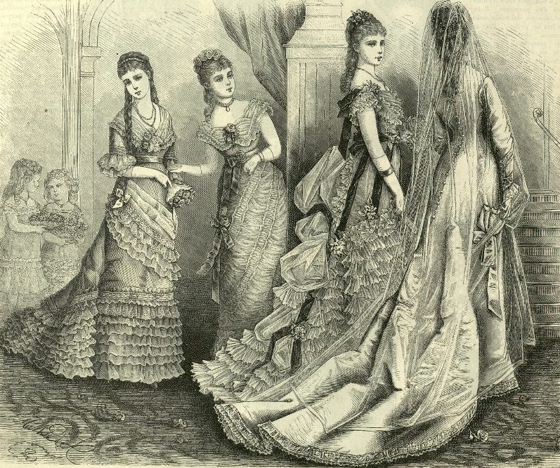 На свадьбе невеста должна была очаровать гостей простотой и скромностью, а не великолепием дорогого наряда. Для молодых леди XIX века подходящим был белый цвет, а женщины постарше могли позволить себе цветные оттенки. Материал платья адаптировали к сезону, чаще всего шили его из муслина, шелка. Невесту на церемонию наряжали женщины из ее семьи, служанки, подружки. Прическу ей делал парикмахер, который на месте решал, что больше подходит молодой, учитывая ее черты лица, цвет глаз и прочее. Приятным дополнением к прическе был венок из мирта или флердоранжа и вуаль. Как ни странно, вдовам полагался венок из цветов апельсина, дополняемый небольшим кружевным шарфиком, заколотым на голове в форме чепца. Букет невесте выбирал и дарит жених, и его обязательно делали из белых цветов. Жениху помогали собираться на свадьбу шаферы, слуги. Его наряд всегда отходил на второй план и состоял из сюртука, брюк черного цвета и белой рубашки.